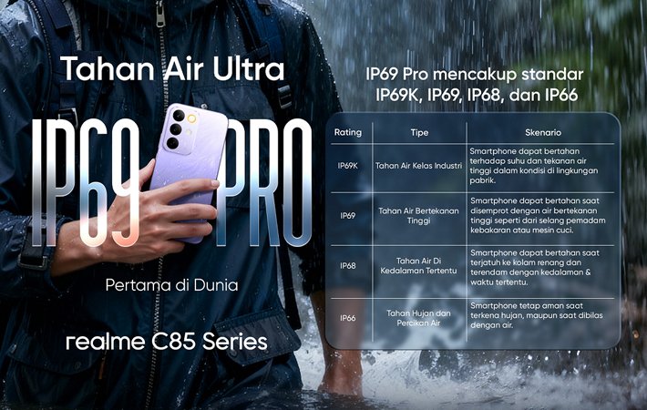 realme C85 Pro dan realme C85 hadir dengan menawarkan keunggulan fitur IP69 Pro pertama di dunia di kelas harga 2 dan 3 jutaan.