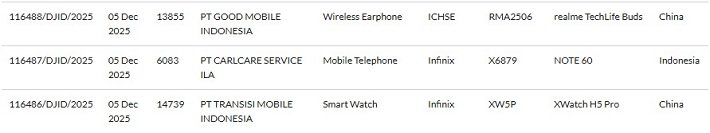Dalam basis data SDPPI, Infinix Note Edge tercatat dengan nomor model X6887, Infinix Note 60 Pro dengan nomor X6878, dan Infinix Note 60 dengan nomor X6879.