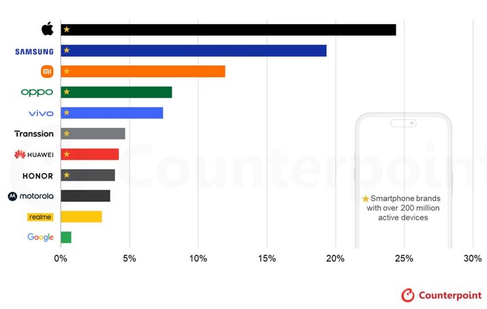 Terbukti dari laporan terbaru dari Counterpoint Research hingga akhir 2025, Apple tetap berada di posisi puncak sebagai brand dengan jumlah perangkat aktif terbanyak.
